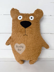 Kuschelbär "Buddy" ist ein kuscheliger Bär aus weichem Baumwollplüsch und ein richtig schönes, kuscheliges Bären-Kissen, dass personalisiert werden kann!
